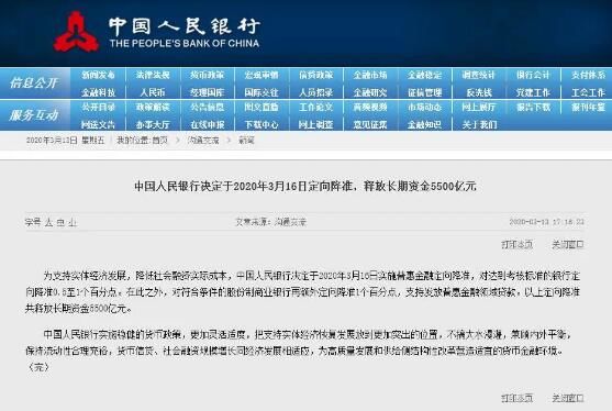 为支持实体经济发展,降低社会融资实际成本,中国人民银行决定于2020年3月16日实施普惠金融定向降准,对达到考核标准的银行定向降准0.5至1个百分点。在此之外,对符合条件的股份制商业银行再额外定向降准1个百分点,支持发放普惠金融领域贷款。以上定向降准共释放长期资金5500亿元。