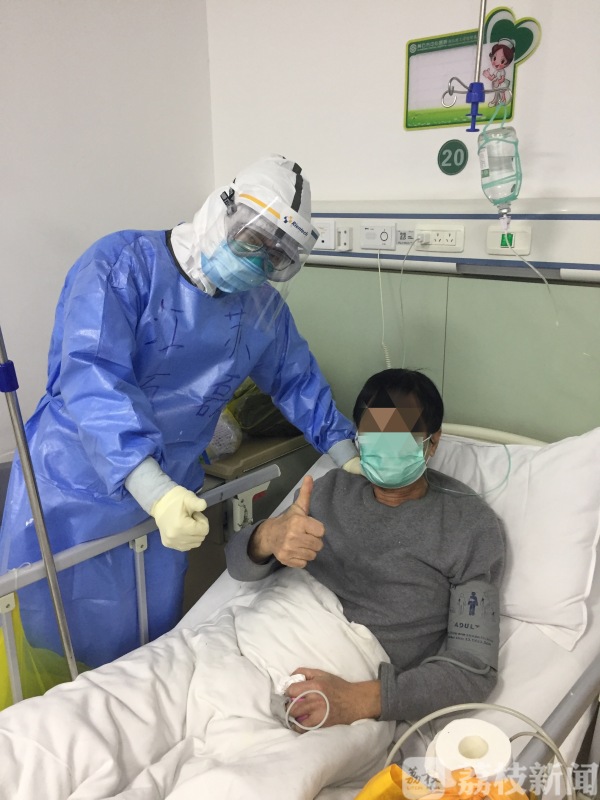 老袁是我印象最深刻的患者,也是这一批病人中最早来的,来的时候刚好我值班,血氧饱和度很低,随时有猝死的可能。他说话很费力,说一会就会满头大汗,对很多治疗也不太配合,说太难受了。我握着他的手,让他少说话,耐心给他分析病情,说下一步的治疗方案以及病情的预期等等。经过和专家组的沟通后建议给老袁使用经鼻高流量氧疗,我一边跟老袁聊着天,根据老袁的适应程度以及氧合情况,一边不断调整着氧疗机的参数。 后面我每次进入病房都会先和老袁握个手,然后给他伸出大拇指,再帮他调整一下氧疗机的参数,慢慢老袁的病情逐渐好转,也能说更多的话了。