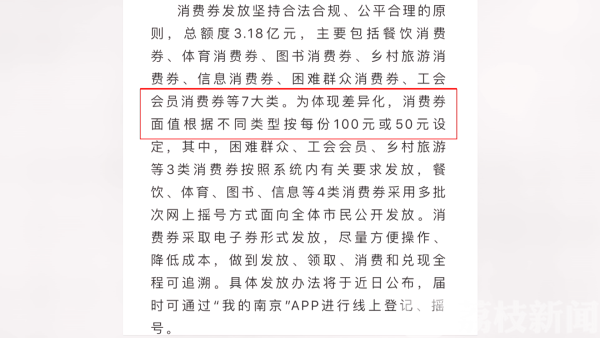 此次消费券的具体发放办法将于近日公布,届时市民可通过“我的南京”APP进行线上登记、摇号。