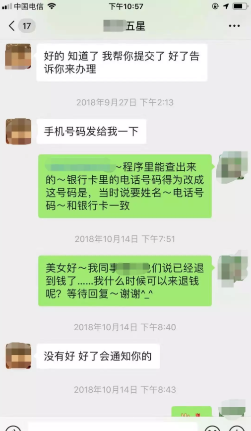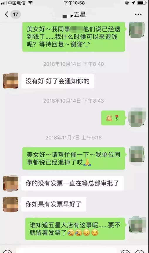 一星期之后(9月27日),五星电器的工作人员主动联系到吴女士询问她的手机联系方式,说事情可能会有转机,但是从这之后再无联系。据吴女士提供消息说,在这之后的半个月时间后(10月14日)她又询问过该店的工作人员,当吴女士问到自己的返款还要再等多久时,该工作人员只是回答吴女士没有发票,仅靠微信支付记录只能等总部审批,而具体流程和等候时间并没有告知吴女士。