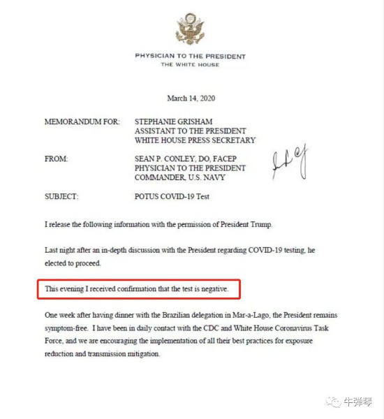 在周六的记者会上,特朗普是这样说的:自己是13日晚上接受的检查,目前还不知道结果,今天的记者会前,他还接受了体温测试,结果正常……