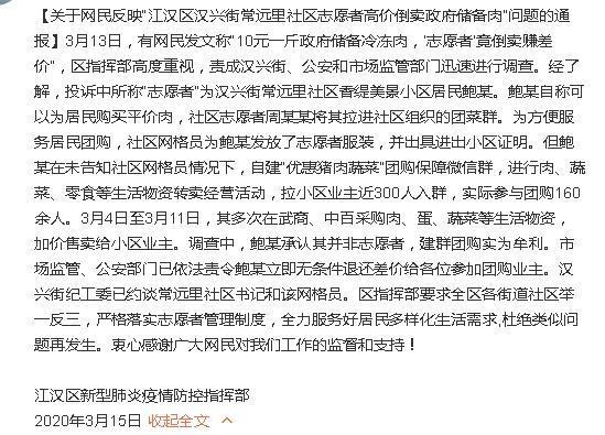 荔枝新闻讯 据武汉市江汉区新型肺炎疫情防控指挥部3月15日通报,3月13日,有网民发文称“10元一斤政府储备冷冻肉,‘志愿者’竟倒卖赚差价”,经调查,投诉中所称“志愿者”实为小区居民鲍某,建群团购加价售卖实为牟利。汉兴街纪工委已约谈涉事社区书记及网格员。