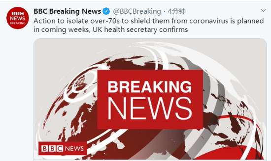 【英媒:英国将隔离70岁以上老人】据BBC当地时间15日报道,英国卫生大臣确认,计划在未来几周内采取行动隔离70岁以上的老人,保护他们免受冠状病毒感染。
