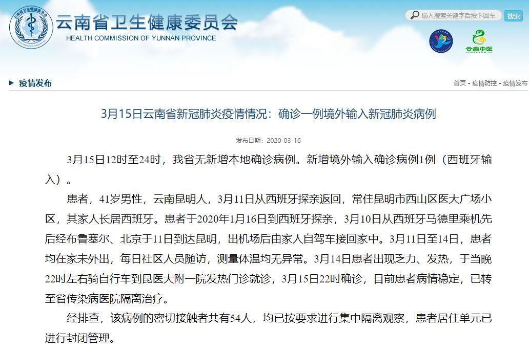 荔枝新闻讯 据云南省卫健委官网消息,3月15日12时至24时,云南省无新增本地确诊病例。新增境外输入确诊病例1例(西班牙输入)。