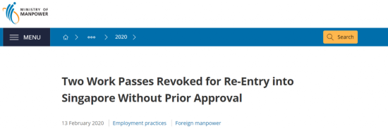 而持有工作准证的人员,如果未按规定在入境前向新加坡政府报批,将会被吊销工作准证。