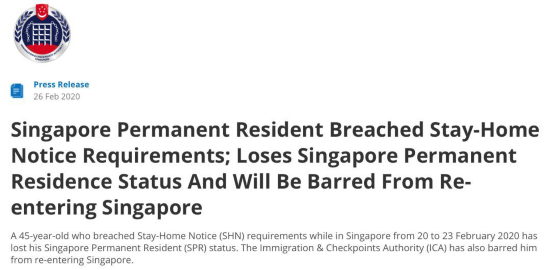 2月26日,新加坡内政部宣布一名45岁的永久居民不仅违反强制居家隔离令,还尝试强行离境,因此被取消永久居民身份并禁止入境。