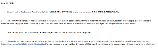 人力部通过海关系统查知记者曾在未经批准的情况下入境新加坡,因此需要复核记者的旅程信息。邮件称,如存在未报批入境情况,工作准证将被立刻吊销,而未按时间要求回复邮件依旧会被立刻吊销准证并驱逐出境。
