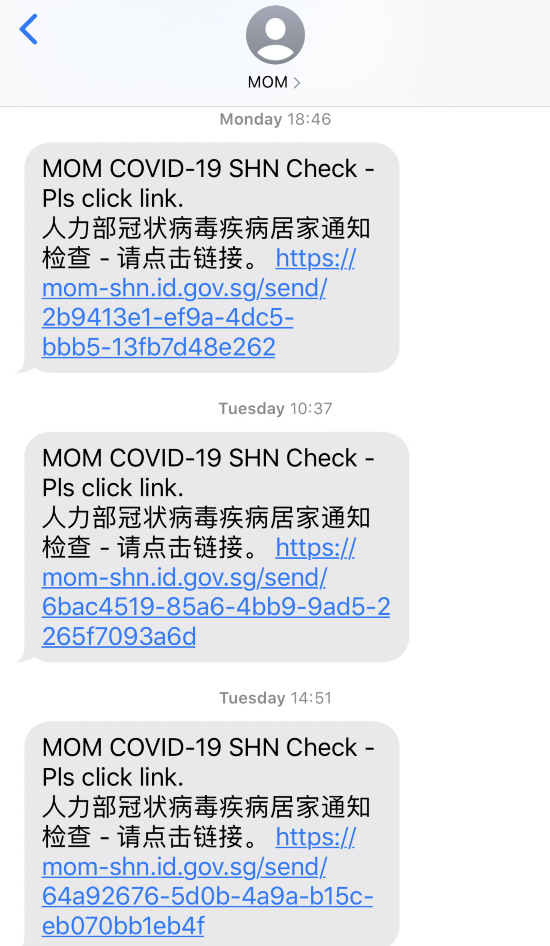 目前,大部分准证持有人都能严格遵守新加坡有关规定,认真填报信息,并且在执行为期14天的强制居家隔离期间按时点击如下短信链接向新加坡政府汇报隔离位置。