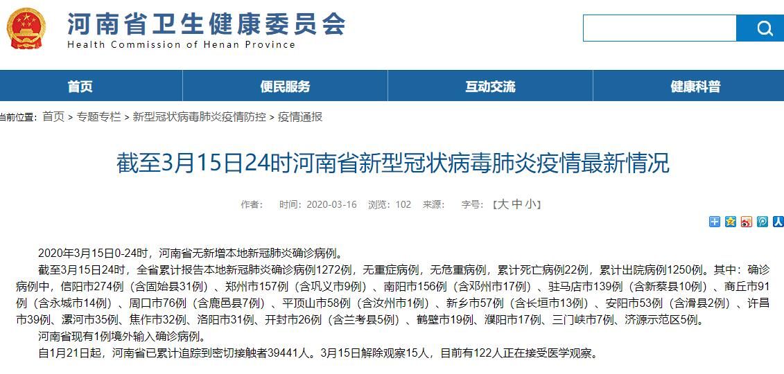截至3月15日24时,全省累计报告本地新冠肺炎确诊病例1272例,无重症病例,无危重病例,累计死亡病例22例,累计出院病例1250例。其中:确诊病例中,信阳市274例(含固始县31例)、郑州市157例(含巩义市9例)、南阳市156例(含邓州市17例)、驻马店市139例(含新蔡县10例)、商丘市91例(含永城市14例)、周口市76例(含鹿邑县7例)、平顶山市58例(含汝州市1例)、新乡市57例(含长垣市13例)、安阳市53例(含滑县2例)、许昌市39例、漯河市35例、焦作市32例、洛阳市31例、开封市26例(含兰考县5例)、鹤壁市19例、濮阳市17例、三门峡市7例、济源示范区5例。