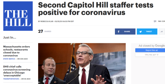 报道提到,几天前,当地时间3月11日,参议员坎特维尔发表声明透露,自己位于华盛顿特区办公室的一名雇员新冠病毒检测呈阳性,她的办公室现已关闭,并已经要求所有与确诊者有接触的员工接受检测。声明还提到,这名工作人员与坎特维尔本人或其他国会议员没有已知的接触。