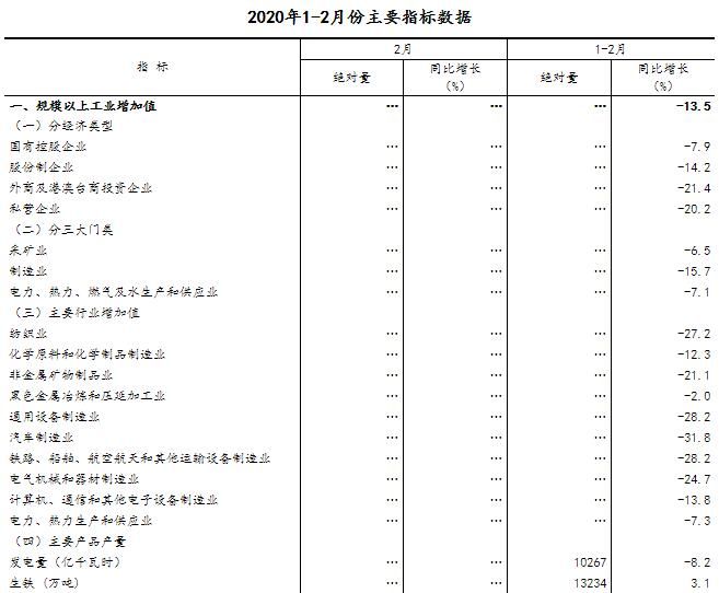 1-2月份,规模以上工业增加值同比下降13.5%。分经济类型看,国有控股企业增加值下降7.9%;股份制企业下降14.2%,外商及港澳台商投资企业下降21.4%;私营企业下降20.2%。分三大门类看,采矿业增加值下降6.5%,制造业下降15.7%,电力、热力、燃气及水生产和供应业下降7.1%。从产品产量看,医疗防护和生活所需物资增长较快,口罩、发酵酒精产量分别增长127.5%和15.6%,冻肉和方便面分别增长13.5%和11.4%。高技术产品增势良好,智能手表、智能手环、半导体分立器件和集成电路产量分别增长119.7%、45.1%、31.4%和8.5%。基本原材料生产平稳,生铁、粗钢、平板玻璃、十种有色金属产量分别增长3.1%、3.1%、2.3%和2.2%。全国采购经理调查数据结果显示,截至2月25日,大中型制造业企业复工率达到85.6%,生产经营活动正有序恢复。