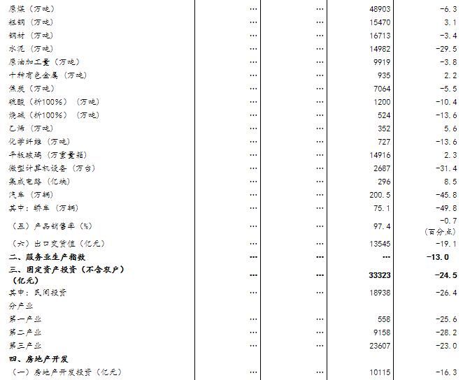 1-2月份,全国固定资产投资(不含农户)33323亿元,同比下降24.5%。分领域看,基础设施投资同比下降30.3%,制造业投资下降31.5%,房地产开发投资下降16.3%。全国商品房销售面积8475万平方米,下降39.9%;商品房销售额8203亿元,下降35.9%。分产业看,第一产业投资下降25.6%,第二产业投资下降28.2%,第三产业投资下降23.0%。民间投资18938亿元,下降26.4%。高技术产业投资下降17.9%,降幅低于全部投资6.6个百分点,其中高技术制造业和高技术服务业投资分别下降16.5%和20.8%。检验检测服务和专业技术服务投资分别增长26.1%和4.3%。社会领域投资下降20.0%,其中卫生领域投资下降11.2%,降幅低于全部投资13.3个百分点。