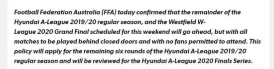 北京时间16日,澳大利亚足协在其官网发文,宣布澳超2019/20赛季的剩余常规赛,以及计划于本周末举行的澳洲女子超级联赛2020赛季总决赛将继续进行,但所有比赛将空场进行,不允许任何球迷参加。