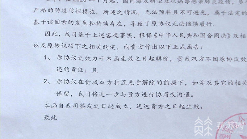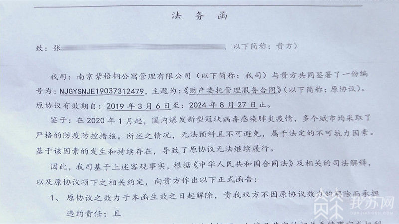 但让张女士没有想到的是,就在她同意减免一个月房租后不久,竟接到了“蛋壳公寓”方面的解约通知和法务函,对方称受疫情这一不可抗力影响,原协议无法继续履行,且双方不承担违约责任,而张女士房屋内的租客,也被“蛋壳公寓”安置到了其他地方。