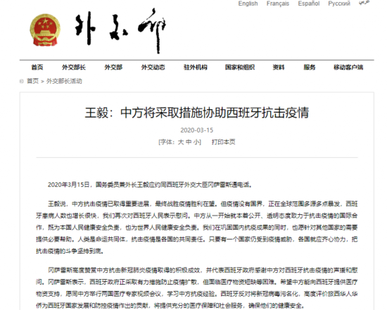 王毅表示,中西两国长期友好,始终相互理解、相互支持。中方不会忘记西班牙对中国抗击疫情给予宝贵理解和支持。中方已决定根据西班牙的需要,紧急提供一批医疗物资援助,并开放商业渠道供西班牙进口急需的个人防护用品和医疗设备。中方也将鼓励友好城市和企业提供帮助,并愿加强经验交流,协调安排两国专家举行医疗视频会,并考虑适时派出医疗专家组。