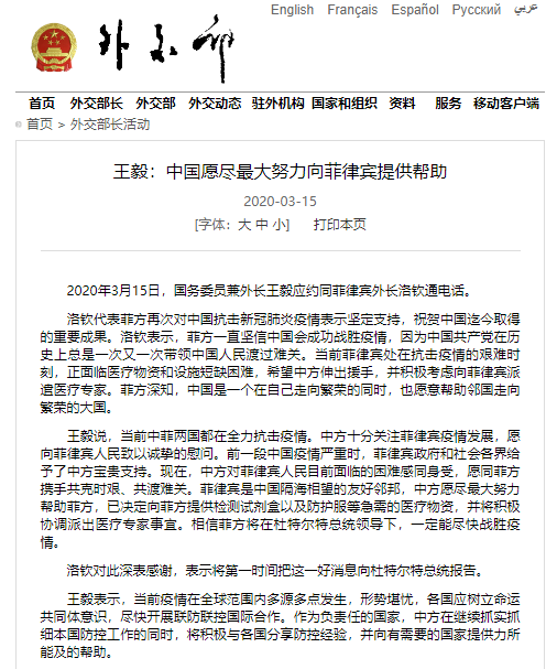 3月15日,国务委员兼外长王毅应约同菲律宾外长洛钦通电话。洛钦代表示,当前菲律宾处在抗击疫情的艰难时刻,正面临医疗物资和设施短缺困难,希望中方伸出援手,并积极考虑向菲律宾派遣医疗专家。菲方深知,中国是一个在自己走向繁荣的同时,也愿意帮助邻国走向繁荣的大国。