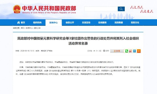 近日,民政部对中国微量元素科学研究会、中国歌剧研究会、中国体育集邮与收藏协会3家社团作出警告的行政处罚。