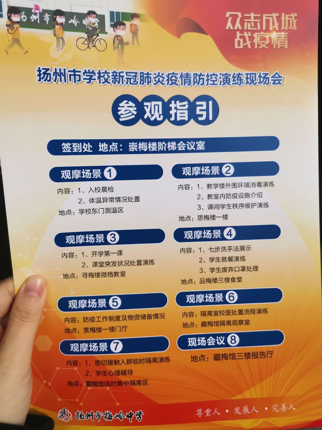 今天下午2:30,扬州市学校新冠肺炎疫情防控演练在梅岭中学拉开帷幕,从学生入校晨检、体温异常情况处理、教学楼外围环境消毒演练、课间秩序维护演练、课堂突发状况处置演练、七步洗手法展示等多个方面,打造开学“疫情防控”的标准版!