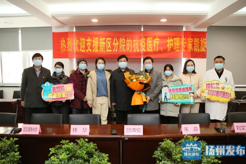 3月16日上午,隔离期满后,苏北人民医院最后一批6名支援新区分院(市第三人民医院)抗疫的医疗、护理专家凯旋,在简短的欢迎仪式上,这6名医护人员不约而同地说:“如果有需要,我们还会挺身而出!”