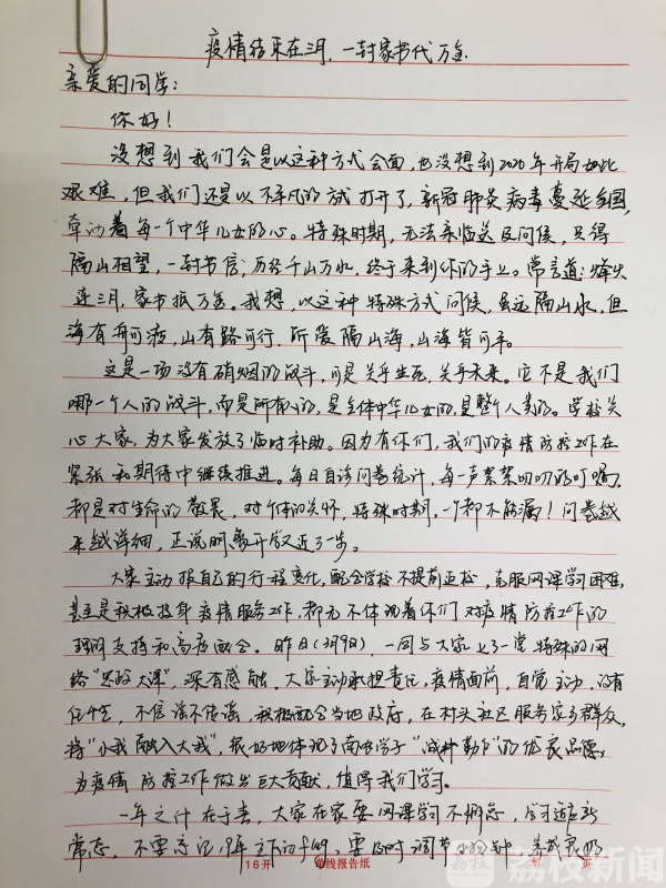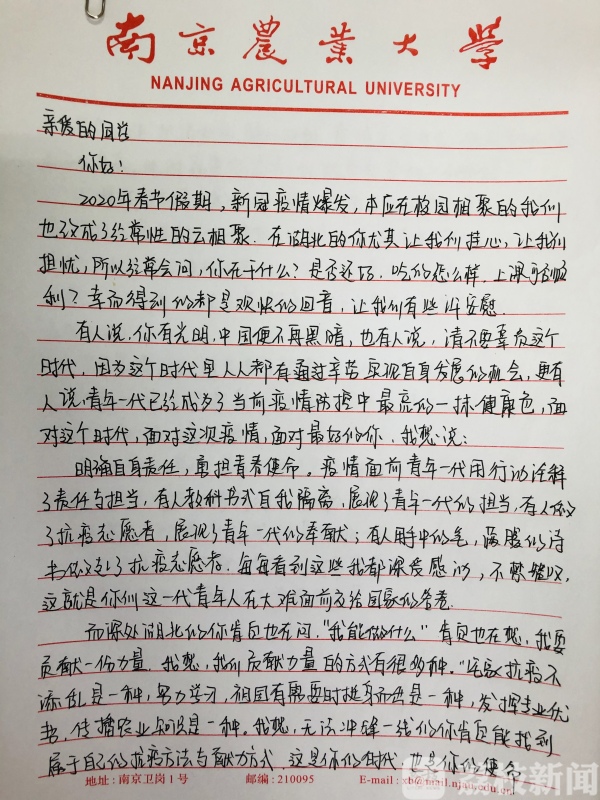 南京农业大学学生工作处处长刘亮告诉记者,在学校前期开展的疫情防控期间学生思想、心理状况动态调研中,有近20%滞留湖北的同学表示身处疫情中心,心里难免焦虑和害怕。在每日不间断的信息化沟通手段外,学工处号召辅导员老师,能否通过手写书信的方式,用文字传递别样温度,倾听学生所想、了解学生所需,送去慰藉与温暖。
