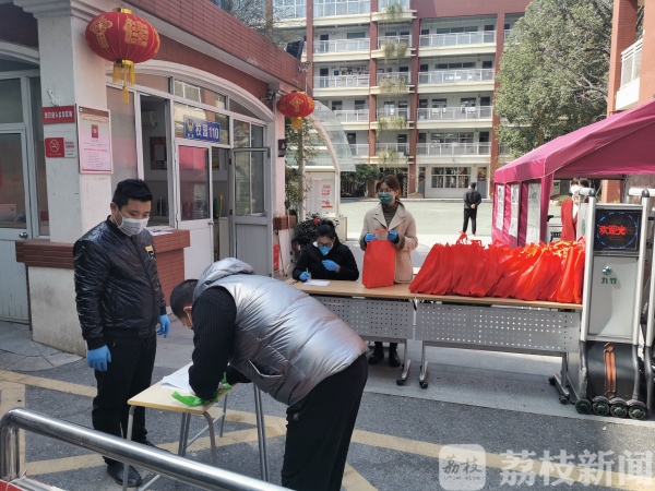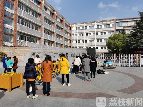 南京理工大学实验小学则在学校门口放了几张桌子,老师们戴着口罩和手套分装课本,按年级错峰发放,同时还有老师疏导家长,保证家长排队间距1米左右。