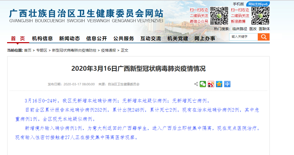 荔枝新闻讯 据广西卫健委网站消息,3月16日0-24时,广西壮族自治区无新增本地确诊病例;无新增本地疑似病例;无新增死亡病例。新增境外输入确诊病例1例。