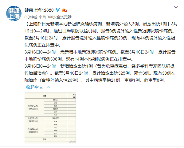 3月16日0—24时,无新增本地新冠肺炎确诊病例。截至3月16日24时,累计报告本地确诊病例338例,现有14例本地疑似病例正在排查中。 3月16日0—24时,新增治愈出院1例(曾为危重症患者,经多学科专家团队积极救治后治愈)。截至3月16日24时,累计治愈出院325例,死亡3例。现有30例在院治疗(含境外输入性20例),其中病情平稳21例,重症1例,危重型8例。