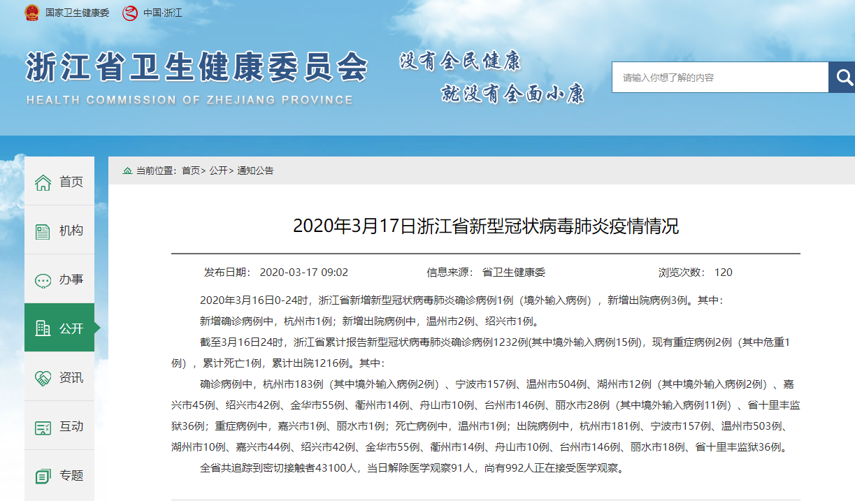 浙江省卫健委官网截图。