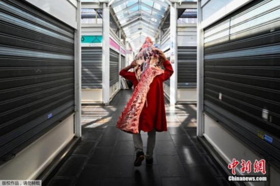 当地时间3月12日,意大利罗马,一名送货员将一扇肉制品运送到市场的摊位上。为遏制疫情蔓延,意大利总理孔特11日晚宣布,关闭全国除食品店和药店以外的所有商铺。