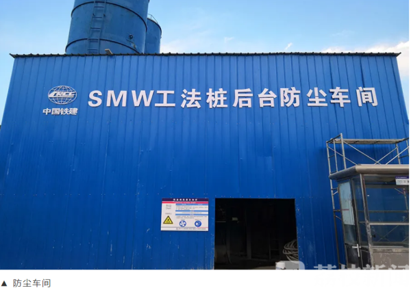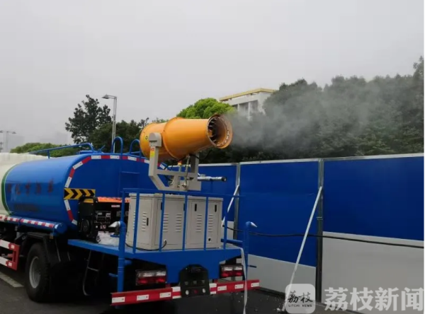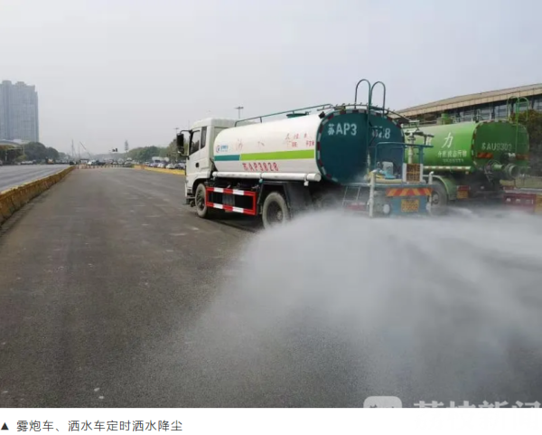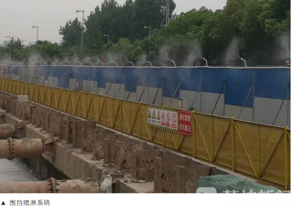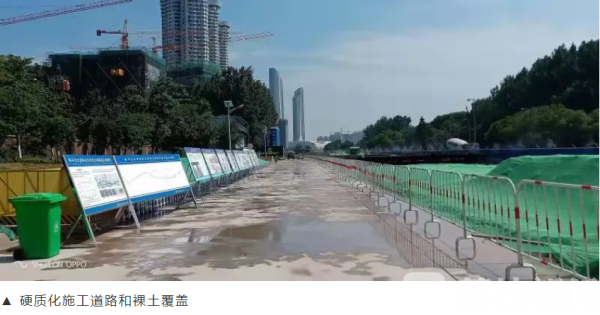 施工现场严格落实“八达标两承诺一公示”制度:围挡达标、道路硬化达标、冲洗平台达标、清扫保洁达标、裸土覆盖达标、工程机械排放达标、油品达标、智慧工地达标,签订《工程机械油品使用承诺书》及《扬尘控制承诺书》,设立扬尘污染防治公示牌。同时,设置围挡喷淋系统,实施雾炮车、洒水车定时洒水降尘,完善辆冲洗台具备未冲洗抓拍功能,还建立了由50名作业人员组成的文明施工队伍,专职负责现场保洁和扬尘治理工作。
