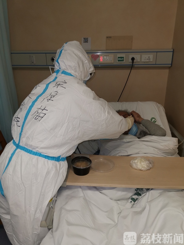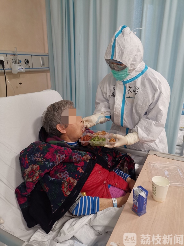 由于我们所在病区都是重症病人,除了患有新冠肺炎,可能还会合并其他疾病,导致自理能力受限。因此在病房里,很多患者需要我们喂饭以及协助大小便,有些还需要提供康复护理。32床阿婆就是这样一位患者,确诊新冠肺炎后又突发脑梗,我们要密切关注阿婆的神志、瞳孔、肌力、生命体征,做好皮肤护理、大小便护理、心理护理,还要指导、帮助她做康复训练,防止肌肉萎缩等并发症。现在,阿婆已经成为我每天牵挂的人之一,上班总会第一时间去看她,下班前也会到床边再看一眼。