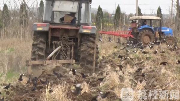 当天上午天气晴好,农机大户正开着大型机械在耕田作业。让人惊奇的是,在每一台机械的后面,都紧跟着黑压压的一片鸟儿,正在寻觅食物,双眼紧追着新犁开的土垅,发现目标后,立即扑上去。