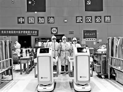 第二个场景跟机器人有关。联盟工作人员告诉记者,在武汉多家医院,来自某机器人科技有限公司的机器人一直和医务人员肩并肩共战“疫魔”。