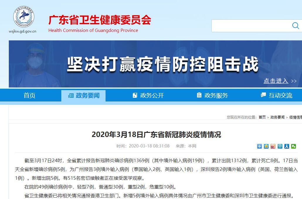 荔枝新闻讯 据广东卫健委消息,截至3月17日24时,全省累计报告新冠肺炎确诊病例1369例(其中境外输入病例19例),累计出院1312例,累计死亡8例。17日当天全省新增确诊病例5例,为广州报告3例境外输入病例(泰国输入2例、英国输入1例),深圳报告2例境外输入病例(英国、荷兰各输入1例)。新增出院5例。有515名密切接触者正在接受医学观察。