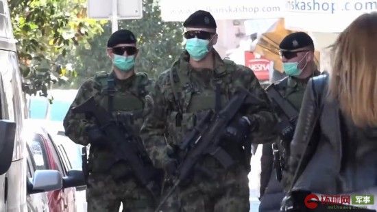 从画面中可以看到塞尔维亚陆军第72特种作战旅的士兵也参与了街头巡逻,他们手中所持的是比利时FN SCAR步枪,这与同样在巡逻的普通部队所用的M21突击步枪(基于AK-74步枪研发)明显不同。塞尔维亚曾从比利时进口740余把SCAR自动步枪,用于装备特种部队使用。