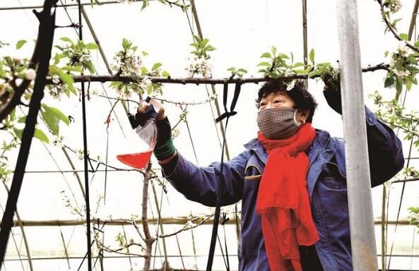铜山区茅村镇洞山村农业产业园内,果农们抢抓农时,忙着给车厘子授粉。 徐报融媒记者 陈艳 摄