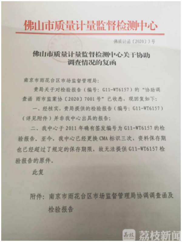 无独有偶,在另一起案件中,由佛山市质量计量监督检测中心出具的编号为G11-WT6157的检验报告也被证实是假报告。