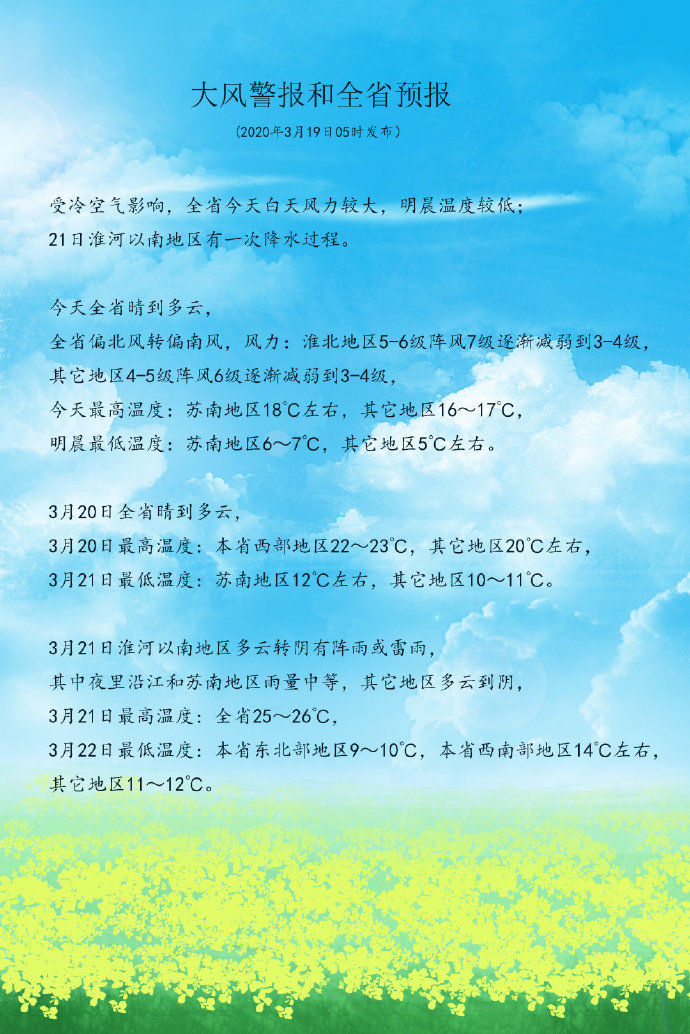 我苏网讯 据江苏省气象台,今天(3月19日)全省晴到多云,全省偏北风转偏南风,风力:淮北地区5-6级阵风7级逐渐减弱到3-4级,其它地区4-5级阵风6级逐渐减弱到3-4级,今天最高温度:苏南地区18℃左右,其它地区16~17℃,明晨最低温度:苏南地区6~7℃,其它地区5℃左右。