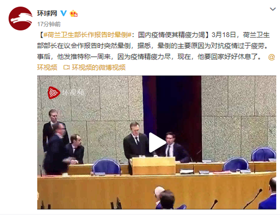 原标题:荷兰卫生部长作报告时晕倒:国内疫情使其精疲力竭 3月18日,荷兰卫生部部长在议会作报告时突然晕倒,据悉,晕倒的主要原因为对抗疫情过于疲劳。事后,他发推特称一周来,因为疫情精疲力尽,现在,他要回家好好休息了。