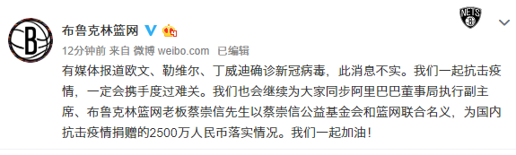 荔枝新闻讯 据布鲁克林篮网官方微博消息,有媒体报道欧文、勒维尔、丁威迪确诊新冠病毒,此消息不实。大家一起抗击疫情,一定会携手度过难关,并且会继续同步阿里巴巴董事局执行副主席、布鲁克林篮网老板蔡崇信先生以蔡崇信公益基金会和篮网联合名义,为国内抗击疫情捐赠的2500万人民币落实情况。