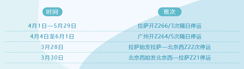 此外,受车站施工影响,3月25日拉萨始发拉萨—北京西Z22次太原东及其以远预计晚点20分钟;3月29日拉萨始发拉萨—北京西Z22次太原东及其以远预计晚点1小时20分钟;3月30日拉萨始发拉萨—北京西Z22次太原东及其以远预计晚点40分钟。