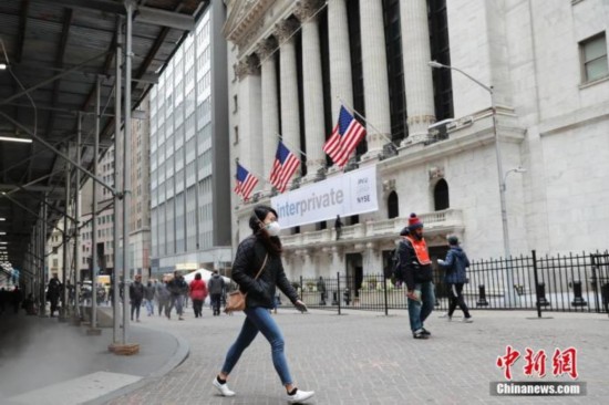 当地时间3月12日,一位戴口罩的民众走过纽约证券交易所。当日,纽约股市三大股指开盘出现暴跌,跌幅超过7%。暴跌行情导致美股再次触发熔断机制,暂停交易15分钟。中新社记者 廖攀 摄