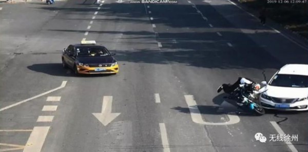 2019年12月6日,徐州泉山区二环北路发生一起摩托车与小轿车相撞事故,摩托车驾驶员被撞飞头部着地,好在驾驶员佩戴了安全头盔,只受了轻伤。