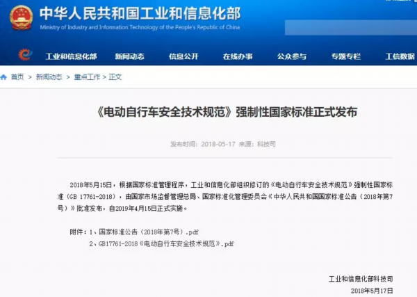 《电动自行车安全技术规范》(新标准)已于2019年4月15日正式实施,经信委等四部门联合下发通知,要求做好电动自行车新标准实施前过渡期备案登记、头盔佩戴等各项工作。