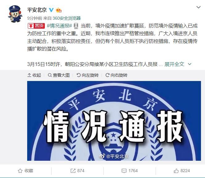 荔枝新闻讯 据平安北京微博消息,当前,境外疫情加速扩散蔓延,防范境外疫情输入已成为防控工作的重中之重。近期,北京市连续推出严格管控措施,广大入境进京人员主动配合,积极落实防控责任,但仍有个别人员拒不执行防控措施,存在疫情传播扩散的潜在风险。