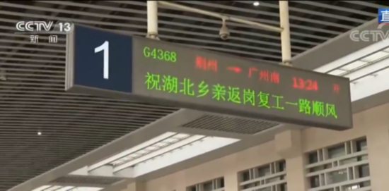 央视网消息:今天(19日)中午,一列搭载着500多名务工人员的高铁专列从湖北荆州出发,去往广东。