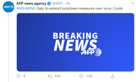 报道称,自3月12日起,意大利在全国范围内关闭了大部分企业,并禁止举行公众集会,该禁令将于3月25日到期。而关闭学校和其他措施,如禁止球迷出席体育赛事等禁令,将持续到4月3日。