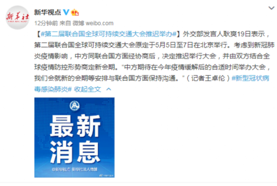 外交部发言人耿爽19日表示,第二届联合国全球可持续交通大会原定于5月5日至7日在北京举行。考虑到新冠肺炎疫情影响,中方同联合国方面经协商后,决定推迟举行大会,并由双方结合全球疫情防控形势商定新会期。“中方期待在今年疫情缓解后的合适时间举办大会,我们会就新的会期等安排与联合国方面保持沟通。”(记者王卓伦)