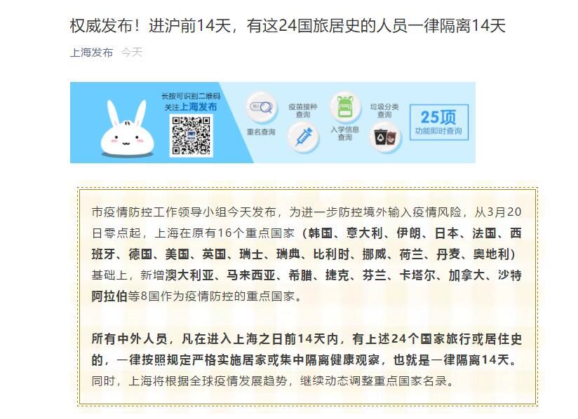 19日,上海市疫情防控工作领导小组发布通知称,为进一步防控境外输入疫情风险,从3月20日零点起,上海在原有16个重点国家(韩国、意大利、伊朗、日本、法国、西班牙、德国、美国、英国、瑞士、瑞典、比利时、挪威、荷兰、丹麦、奥地利)基础上,新增澳大利亚、马来西亚、希腊、捷克、芬兰、卡塔尔、加拿大、沙特阿拉伯等8国作为疫情防控的重点国家。所有中外人员,凡在进入上海之日前14天内,有上述24个国家旅行或居住史的,一律按照规定严格实施居家或集中隔离健康观察,也就是一律隔离14天。