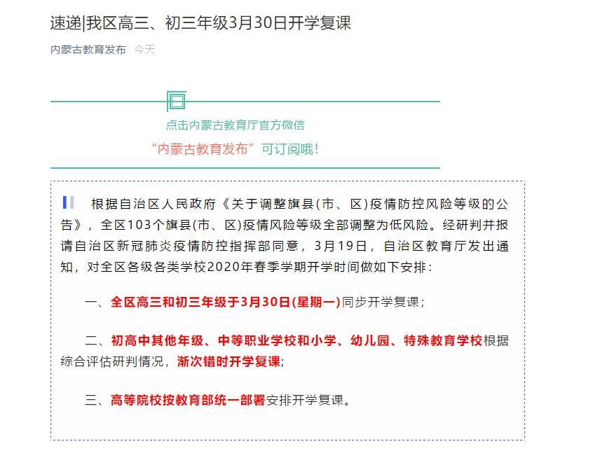 荔枝新闻讯 据内蒙古自治区教育厅官方微信消息,3月19日,内蒙古自治区教育厅发出通知,对全区各级各类学校2020年春季学期开学时间做如下安排: